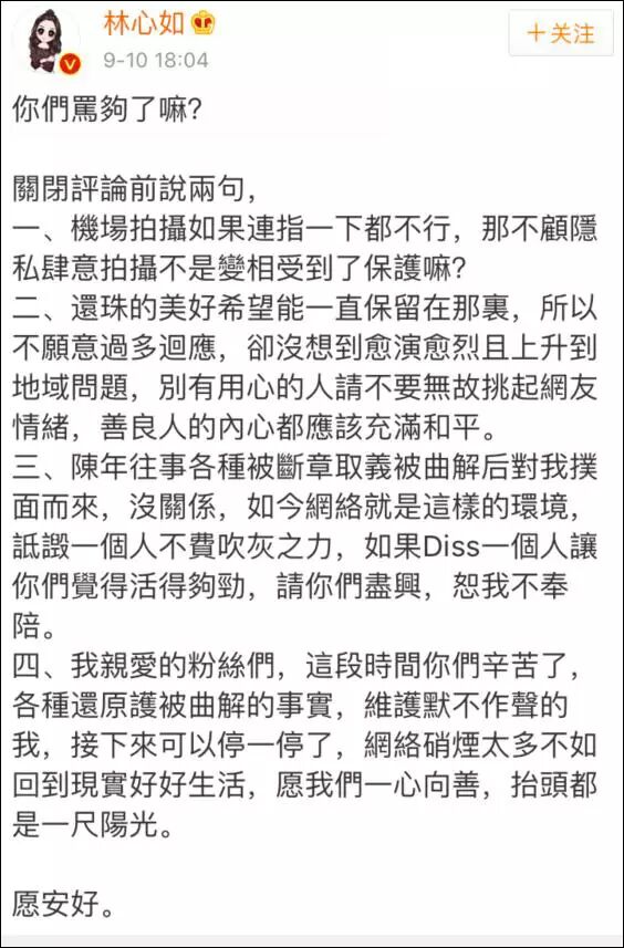 此前,处在风口浪尖的林心如在微博发长文,宣布将关闭微博评论,并对老公霍建华机场手指镜头与近期和周杰的风波作出回应,还称“陈年往事各种被断章取义被曲解后对我扑面而来,没关系,如今网络就是这样的环境,诋毁一个人不费吹灰之力,如果Diss一个人
