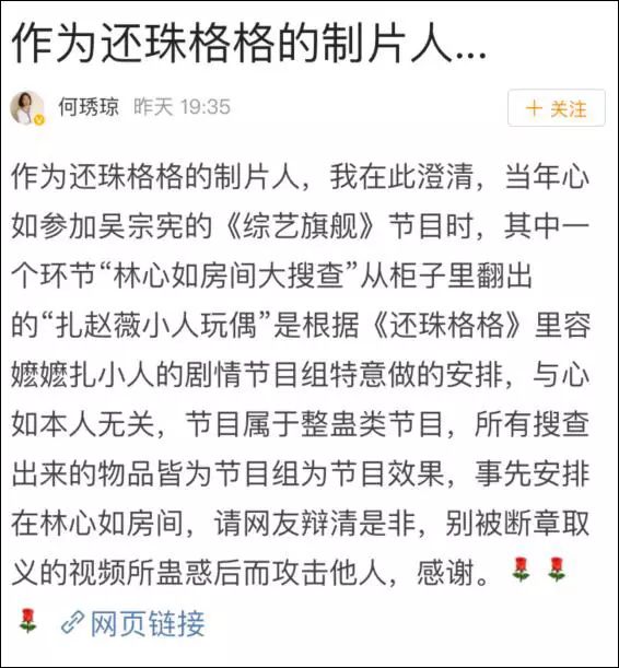 9月10日,《还珠格格》制片人何琇琼发文澄清,称当年心如参加吴宗宪的《综艺旗舰》节目时,其中一个环节“林心如房间大搜查”从柜子里翻出的“扎赵薇小人玩偶”是根据《还珠格格》里容嬷嬷扎小人的剧情节目组特意做的安排,与林心如本人无关,节目属于整蛊类节目,所有搜查出来的物品皆为节目组为节目效果,事先安排在林心如房间,她呼吁网友辩清是非,别被断章取义的视频所蛊惑后而攻击他人。