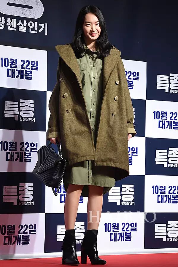 申敏儿身着NLST军绿色大衣与衬衫裙、拎圣罗兰 (Saint Laurent) 黑包现身电影《独家报道:良辰杀人记》的VIP试映式