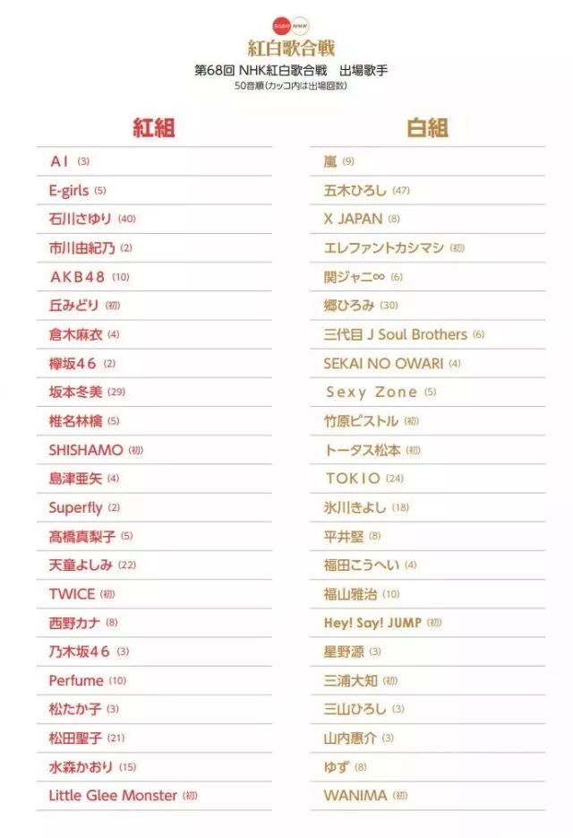 “红白歌会”日文全称红白歌合战,每年由日本广播协会(NHK)举办,是代表日本最高水准的歌唱晚会。参赛者都是从当年日本歌坛中选拔出来的最有实力、人气旺、人品好并受到广大歌迷喜爱的歌手。按照性别将歌手分为两队,其中女歌手组成红队,男歌手组成白队。比赛通常由红队歌手首先登场,之后两队歌手交替上场,参赛者可以是一人独唱,也可以是多人组合。