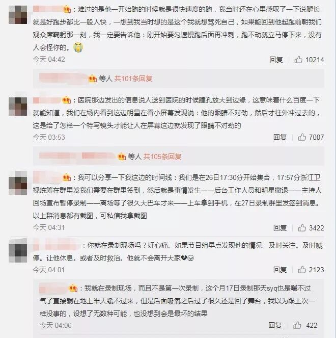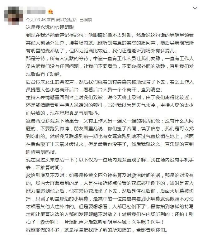 当时现场究竟如何,节目组人员是如何在第一时间处理这种危急情况的?我们能够从观众、粉丝及当时目击者的叙述中拼凑出大概的画面。
