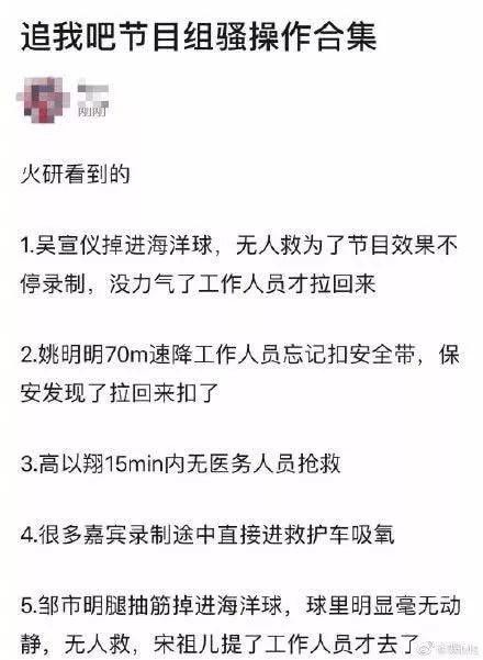 这种事业不是第一次发生了,比如邓超录跑男手臂骨折、张杰王牌对王牌晕倒并被道具砸、释小龙助理溺亡、陈伟霆跨年舞台有坑,以及追我吧邹市明林允李振宁被折腾到吸氧。