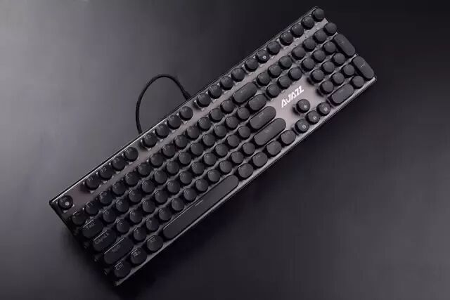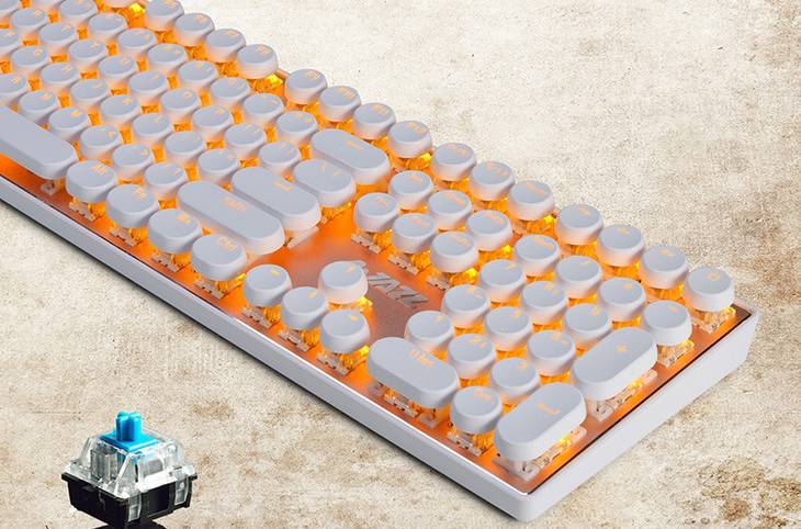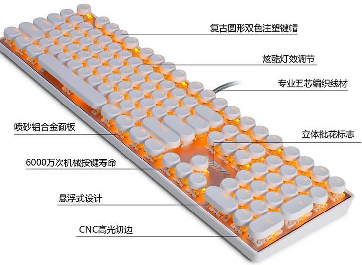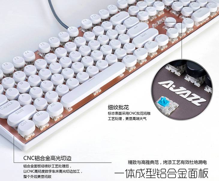 复古圆形键帽+节奏感强劲的青轴,键盘键帽表面均设计了凹槽,这对于稳定手感有帮助。两个颜色都炫爆了!