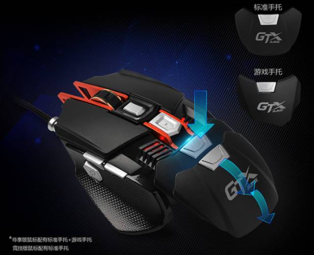 可调整手托的高度及位置:通过旋转鼠标尾部的不锈钢螺丝按钮,调节手托的高低位置,使鼠标更加贴合掌型,能有效缓解长期操作的压力,保证舒适握杆。