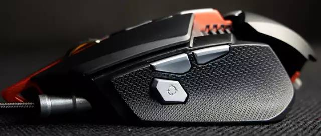 整个鼠标是构建在一个铝合金底盘骨架上,非常稳固。掌心以握趴的形式掌握鼠标,磨砂小阻力不用担心手滑,驾驭起来很舒适驭。按键清脆干净,相当适合FPS游戏。