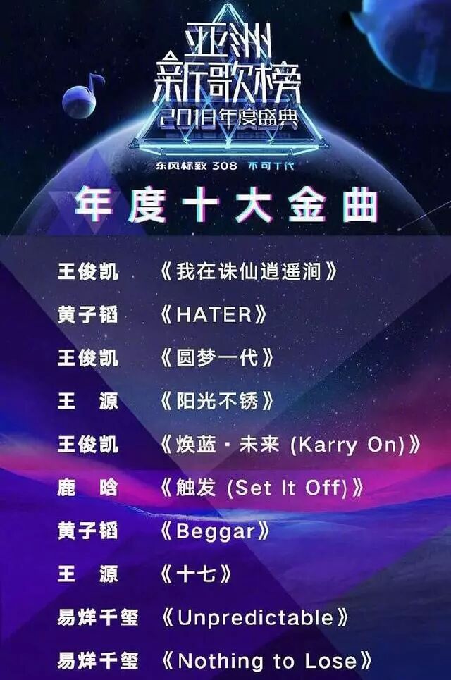 专门查了下2018的年度十大金曲,怀疑是不是自己眼瞎了!没有一首歌是听过的,也没有一首是在哪里看过名字有印象的!但是演唱者全认识,都是流量小生,十首歌就五个人,TFBOYS的三个人王俊凯、王源、易烊千玺都在,另外两个黄子韬和鹿晗。