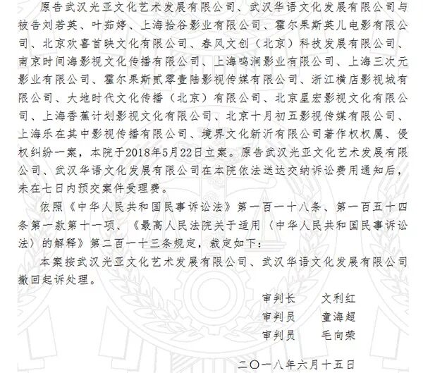 2018年6月15日,湖北高院裁定该案按武汉光亚文化艺术发展有限公司、武汉华语文化发展有限公司撤回起诉处理。