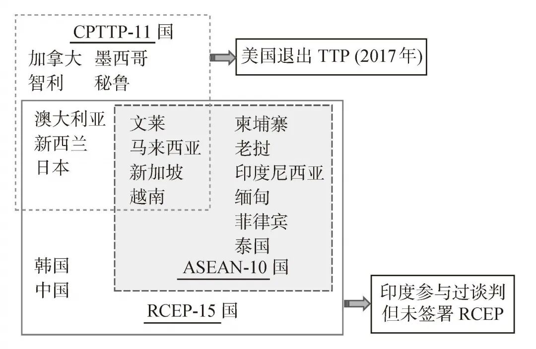 图 1 RCEP与ASEAN、CPTPP的经济体构成及其关系