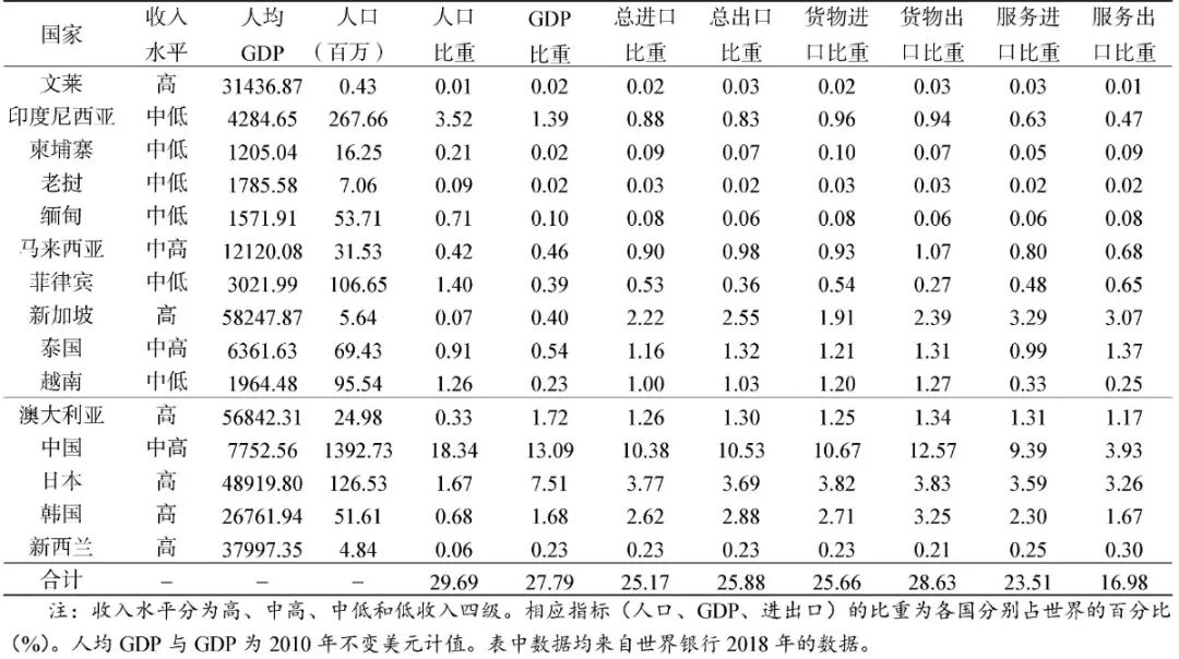 根据世界银行标准,RCEP国家的收入水平跨越三个等级,最高实际人均GDP(新加坡)是最低实际人均GDP(柬埔寨)的48倍(见表1)。其中,高收入国家6个、中高收入国家3个、中低收入国家6个。因此,RCEP是一个比较典型的垂直型FTA。