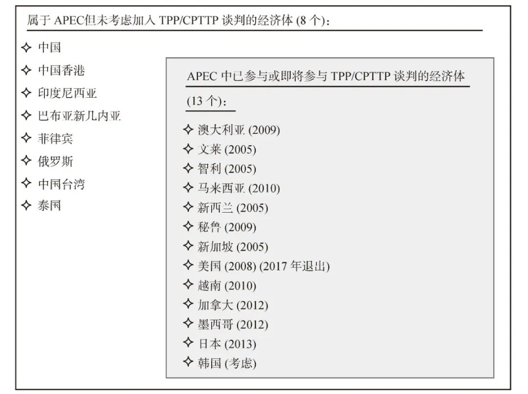 图5 目前APEC和TPP/CPTTP的经济体构成及其关系