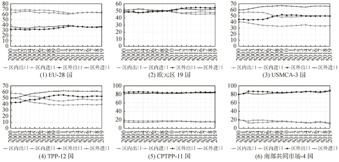 注:图中指标“区内出口”“区外出口”“区内进口”“区外进口”分别表示FTA的区内出口、区外出口分别占总出口的百分比(%),区内进口、区外进口分别占总进口的百分比(%)。数据来源:基于CEIC数据计算整理而得。