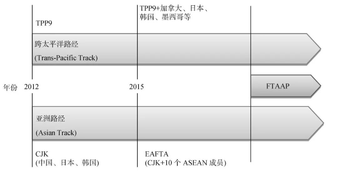 早在2010年11月,APEC第18次领导人非正式会议发表《横滨宣言》,提出在建立贸易和投资更为自由化、更为开放的APEC共同体的同时,把推进亚太自由贸易区(Free Trade Area of the Asia-Pacific,FTAAP)作为建立紧密的亚太共同体的基本途径,并强调以三个已有的区域性合作机制,即“10+3”(东盟+中、日、韩)、“10+6”(东盟+中、日、韩、印、澳、新)和TPP为基础,使之进一步发展,最终缔结综合性的自由贸易协定。由于之前以“10+3”为基础的东亚自由贸易区和以“10+6”为基础的东亚共同体尚在协商或构想之中,而TPP则已生效多年并逐渐扩大,因而受到普遍关注。