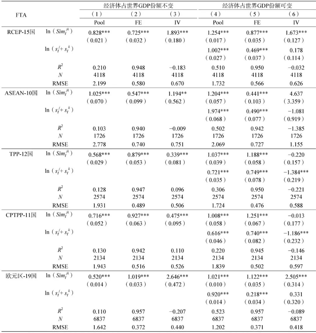 表4报告了基于公式(2)的回归结果。我们将RCEP与其他几个代表性FTA进行比较。回归模型(1)、(2)、(3)将区域内经济体占世界GDP的比重看作是固定不变的,回归模型(4)、(5)、(6)将区域内经济体占世界GDP的比重看作是可变的。每一组回归都分别考虑了混合OLS回归、国家组对(country pair)固定效应以及2SLS回归。在进行2SLS回归时,我们仿照Debaere的做法,采用经济体的人口份额作为GDP份额的工具变量,然后使用预测的GDP值计算国家份额与相似度指数。