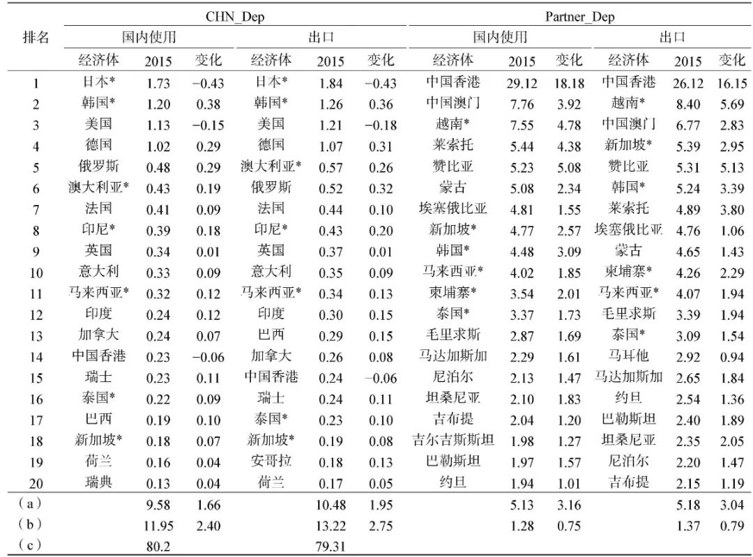 注:*表示 RCEP 成员国。“变化”表示 2015 年的数值减去 2002 年的数值。对于 CHN_Dep,(a)为前 20 大经济体总和;(b)为全球总和;(c)为前 20 大经济体所占比重。对于 Partner_Dep,(a)为前 20 大经济体平均;(b)为全球平均。