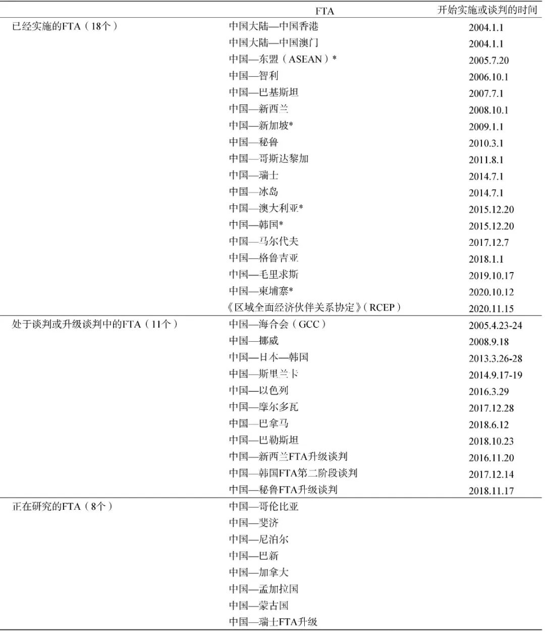 注:对于已经实施的 FTA,对应的时间是实施日期。对于正在谈判的 FTA,对应的时间是谈判开始日期。*表示中国的双边 FTA 伙伴也是 RCEP 成员。资料来源:根据中国自由贸易区服务网(http://fta.mofcom.gov.cn/)的信息整理而得。