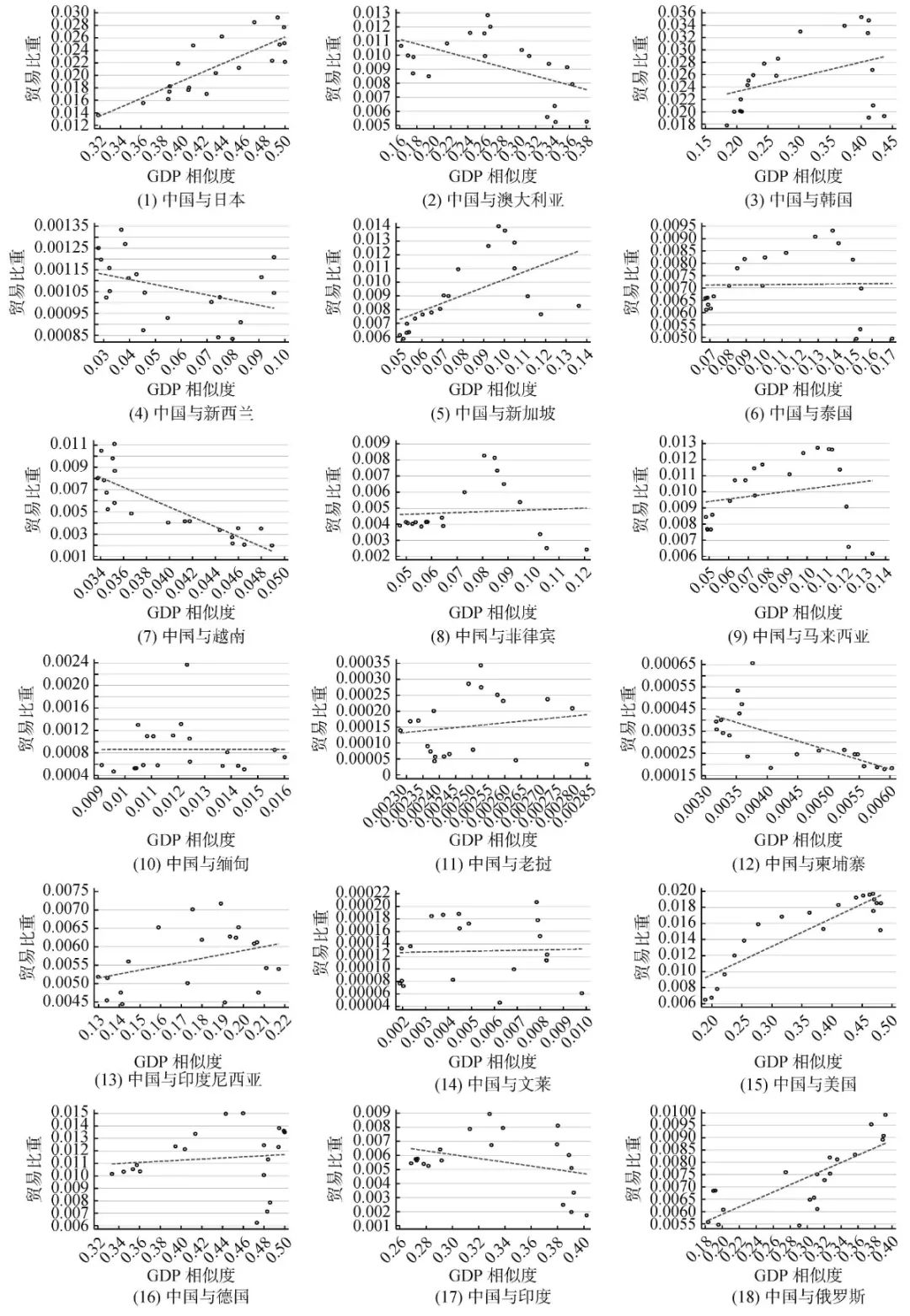 注:基于公式(1),计算双方 GDP 的相似度(横轴)与双边贸易占双方 GDP 总额的比重(纵轴)。样本时期均为 2000—2019 年。