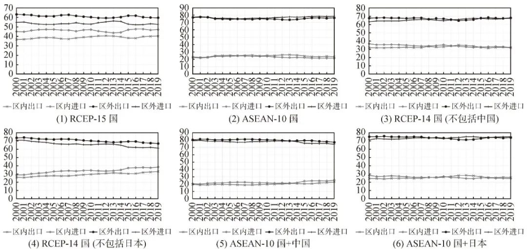本部分基于国际比较,首先从区内外贸易的角度评估RCEP的一体化水平,然后分析RCEP国家与中国的价值链关联。