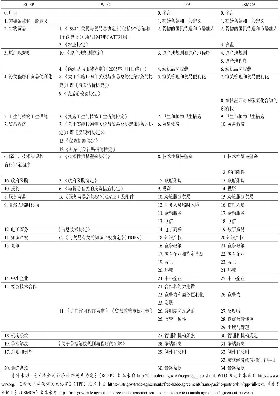 协定文本及其体现的一系列规则与政策,不仅是FTA运行的法律基础,也能反映FTA的自由化与高端化水平。为了弄清RCEP框架下的规则与政策协调,我们将RCEP的协定文本与WTO、TPP/CPTTP、USMCA的协定文本进行比较(见表5)。