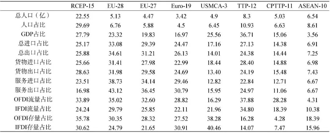 注:相应指标(人口、GDP、进出口、FDI)的占比为各国分别占世界的百分比重(%)。EU-28表示欧盟28国(即包括奥地利、比利时、丹麦、芬兰、法国、德国、希腊、爱尔兰、意大利、卢森堡、荷兰、葡萄牙、西班牙、瑞典、英国、塞浦路斯、捷克、爱沙尼亚、匈牙利、拉脱维亚、立陶宛、马耳他、波兰、斯洛伐克、斯洛文尼亚、罗马尼亚、保加利亚、克罗地亚),EU-27表示去掉英国(脱欧)之后的27国。Euro-19表示欧元区19国(即包括奥地利、比利时、塞浦路斯、芬兰、法国、德国、希腊、爱尔兰、意大利、卢森堡、马耳他、荷兰、葡萄牙、斯洛文尼亚、西班牙、斯洛伐克、爱沙尼亚、拉脱维亚、立陶宛)。USMCA-3为美国—墨西哥—加拿大自贸区,其前身为北美自贸区(NAFTA)。TTP-12表示包含美国在内的《跨太平洋伙伴关系协定》(TPP)12国,CPTTP-11表示美国退出之后的《全面且渐进的跨太平洋伙伴关系协定》(CPTPP)11国。ASEAN-10表示东盟10国。