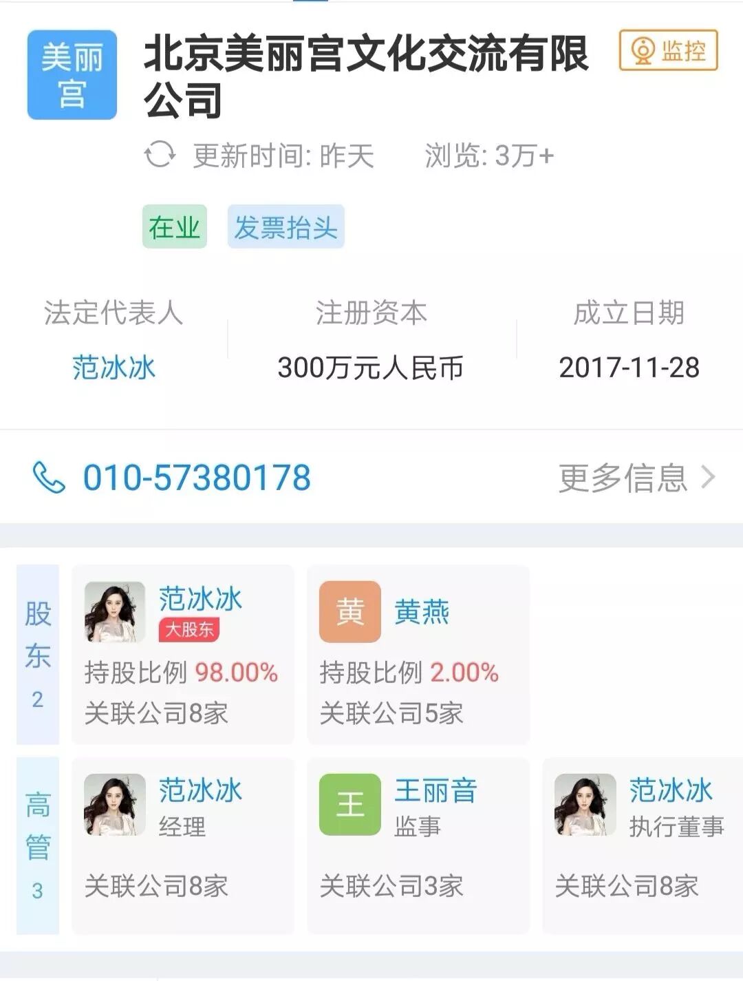 其中,北京美丽宫文化交流有限公司的法定代表人即为范冰冰,这家公司成立于2017年,注册资本为300万元。经营范围包括:组织文化艺术交流活动(不含演出);文艺创作;技术开发、技术咨询、技术服务;会议服务;承办展览展示活动;市场调查;企业策划。