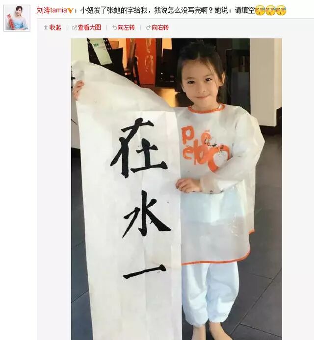3月27日下午,刘涛在微博晒出一张女儿的照片,并写道:“小妞发了张她的字给我,我说怎么没写完啊?她说:请填空。”