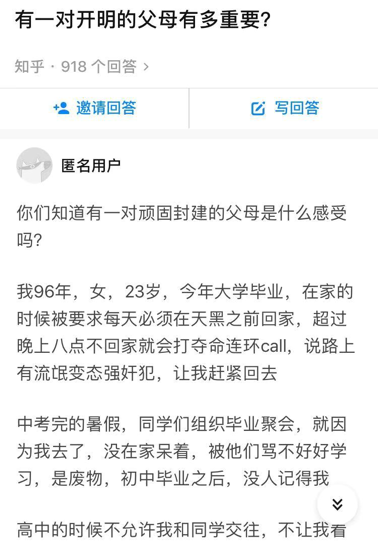 知乎话题“有一对开明的父母有多重要?”上,一个匿名网友的分享引起我的注意。