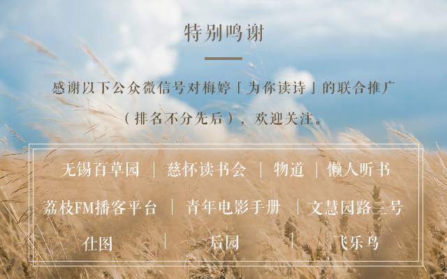 欢迎更多优质公众微信号、微博加入「为你读诗」联合播出平台,共同传播「为你读诗」独家音、视频节目,详情请联系:[email protected]