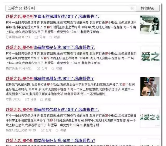 其实前一段时间,小编就已经看过了一篇“那个叫**的南京女孩,10年了,我来找你了!”当时真为主人公的痴心感动了一把,可在随后的几天。发现这个女孩又跑到大连去了,接着跑到福建,贵州。。。好吧,网上一搜,果然已经跑到了全国各地。