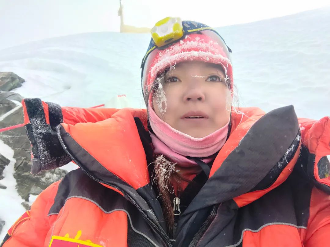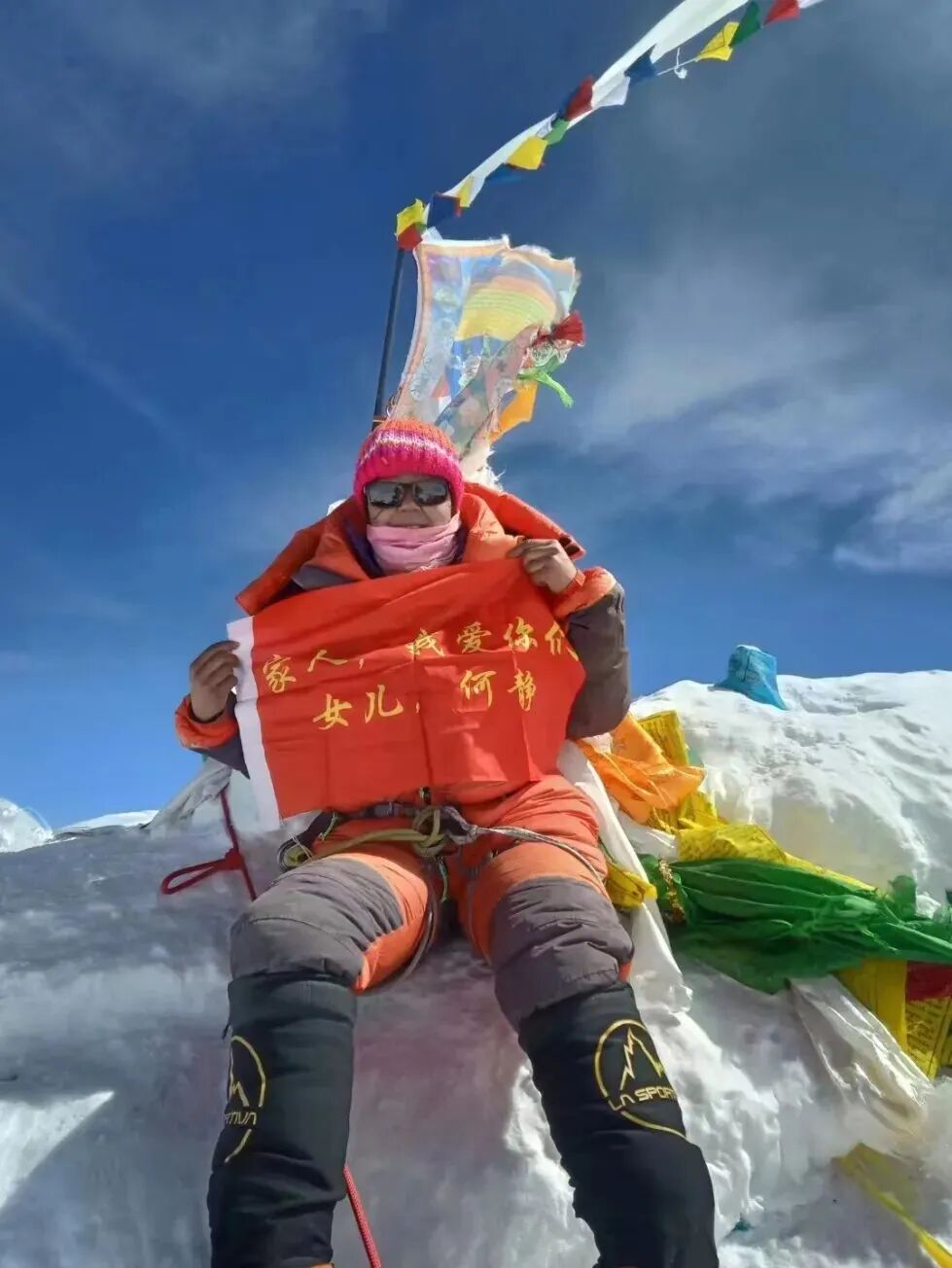 2022年5月14日,何静无氧登顶珠峰,在她登顶的时段,顶峰一丝风也没有,她没有特别的兴奋,摘下厚厚的手套,展旗,拍照,又赶快带上手套。