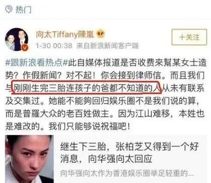 因为孩子生父没有公开,还引来了前干妈向太的讽刺,“连孩子的爸爸是谁都不知道”。