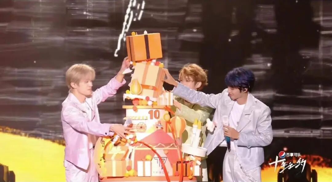 昨晚气氛最高潮的一刻,是十周年的蛋糕塌了。一整场都没有互动过的三个人在混乱中捡起蛋糕碎片,相视一笑,是整场演唱会最荒唐却最鲜活的一幕。主持人救场时说,这是他们三人一起一点一点拼凑起他们十年的记忆。而三个人的合力托举,正是十周年的力量。