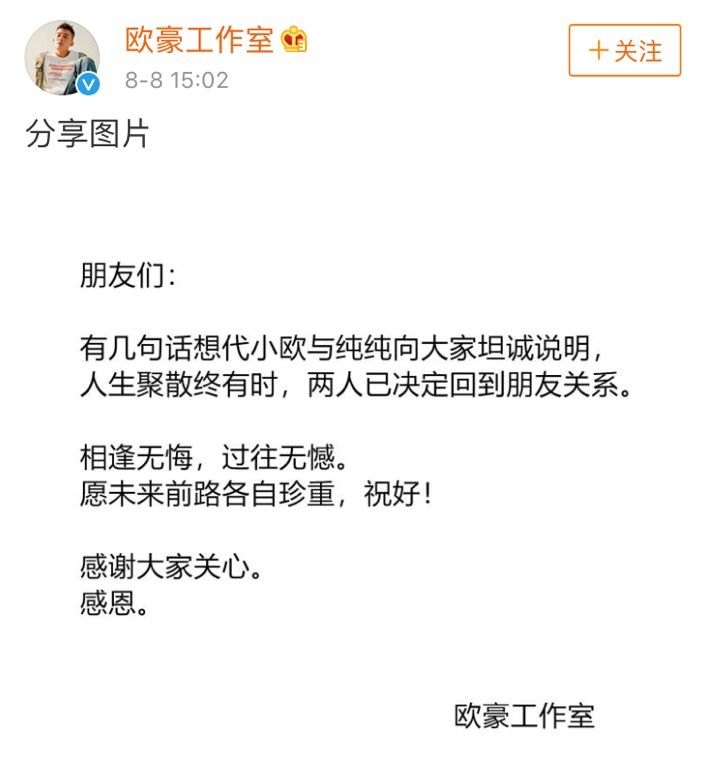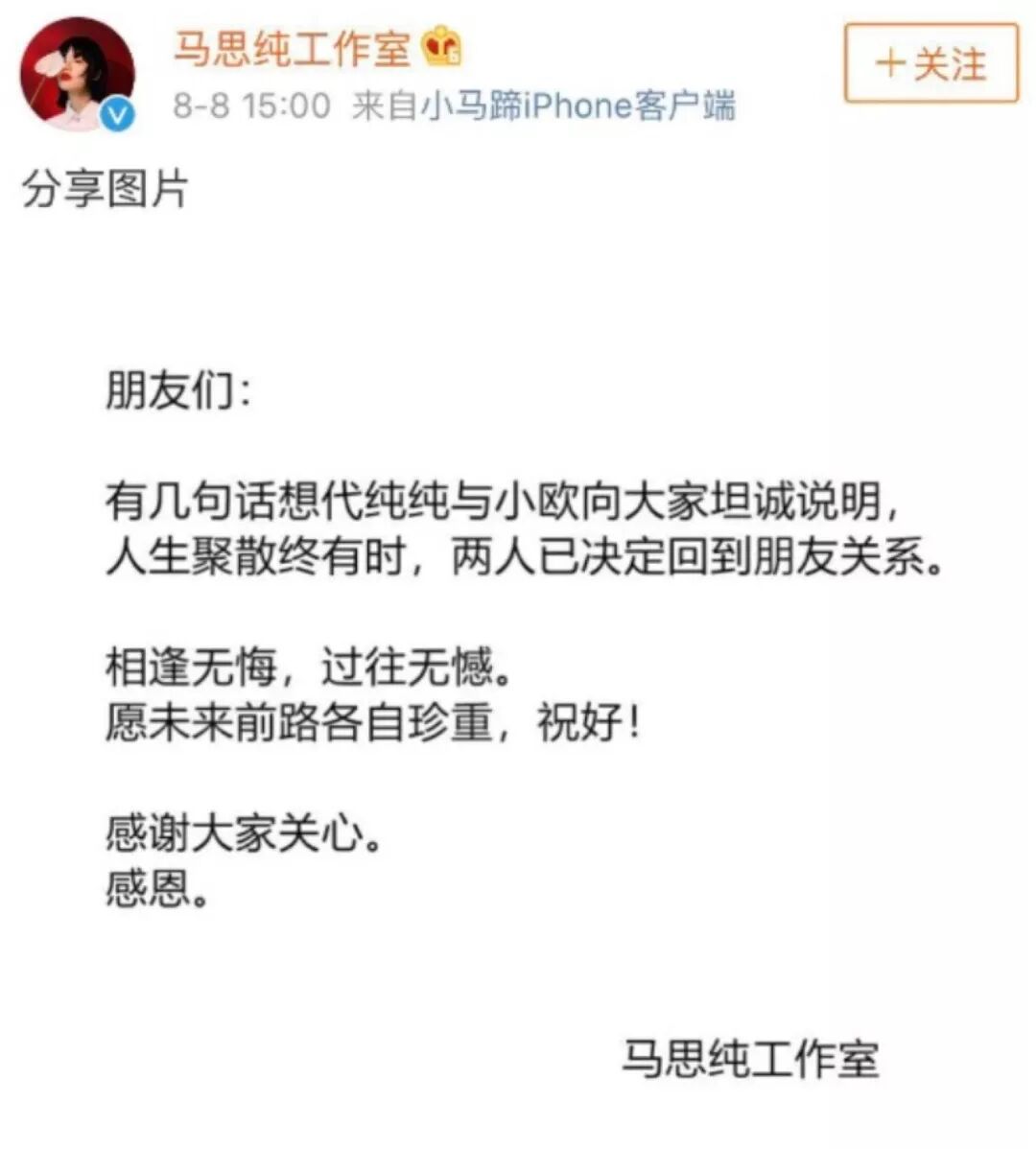 深情而不纠缠,才是最好的爱情观,没必要把回忆搞得比经历还长,就像马思纯和欧豪在声明里说的: