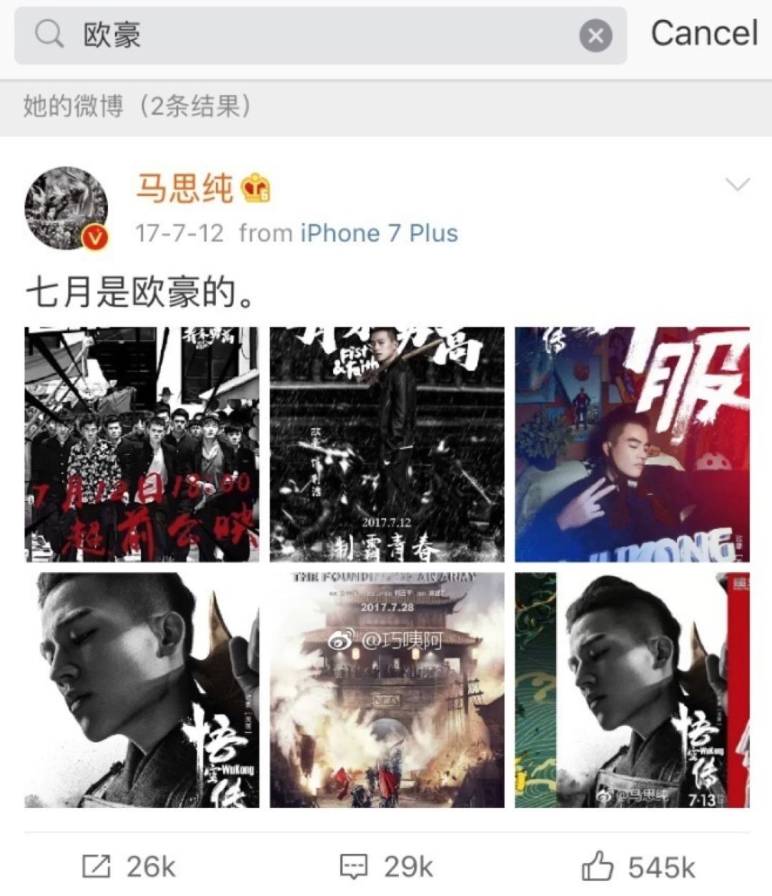去年马思纯的一条微博,更是大胆地向欧豪示爱:“七月是欧豪的”。