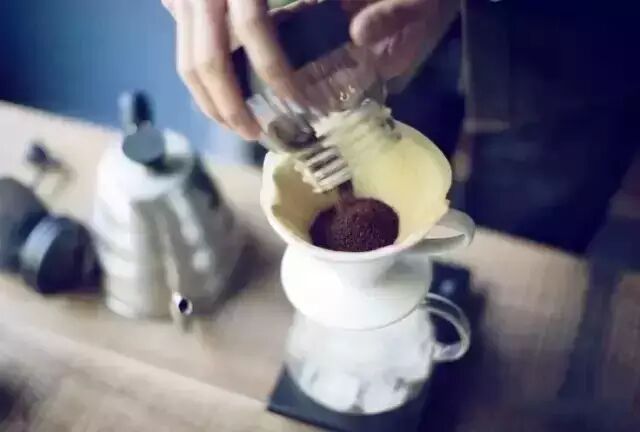咖啡粉倒进滴滤杯后需轻轻摇晃下使其平铺,这是个非常容易忽视的步骤,或者用力过猛,摇晃太多下,都是不可取的。粉面的平整度决定了手冲咖啡焖蒸和萃取的均匀度,直接导致了咖啡的口感。