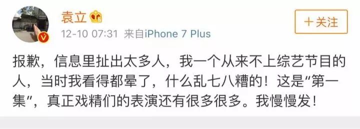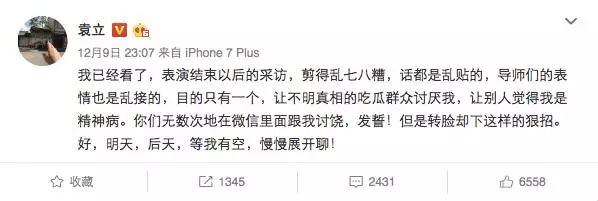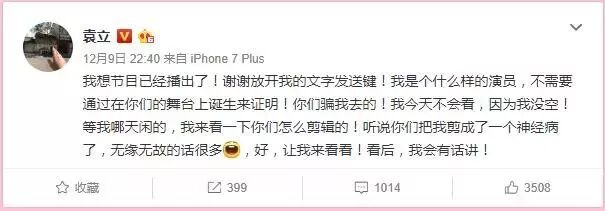 等到12月9日晚上10点节目播出后,袁立的微博又恢复正常了,又可以发表言论了。