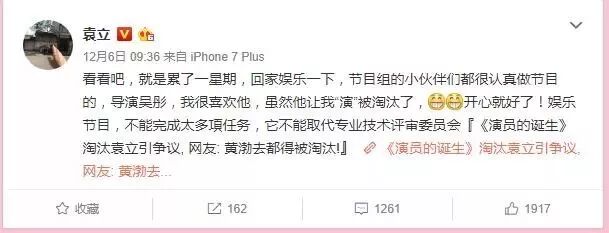 12月6日,袁立在微博发牢骚,直言《演员的诞生》节目总导演吴彤让自己“演”了被淘汰,说明这个竞技节目是有剧本的。