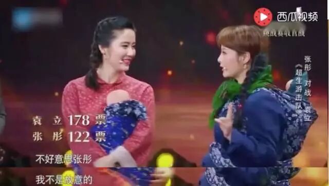 事情是这个样子的,在节目中袁立和张彤一起挑战经典小品《超生游击队》,结果输给了张彤。