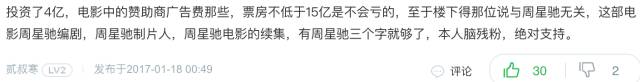 虽然不再演电影,但这一点没妨碍周星驰继续引领喜剧狂潮,对于《西游伏妖篇》有网友表示:这部电影周星驰编剧,周星驰制片人,周星驰电影的续集,有周星驰三个字就够了。