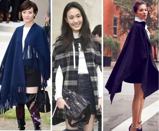 我之前的文里有说到过,矮个子的北鼻最好不要穿过膝长款的衣服,因为会让你看上去十分累赘,但是你可以选择那种前短后长的斗篷,只要能拉高腰线,就能解决问题了,比如钟小姐这种: