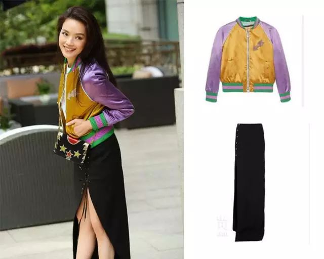 舒淇身穿Gucci真丝刺绣短夹克,搭配Mugler侧置纽扣半身裙。