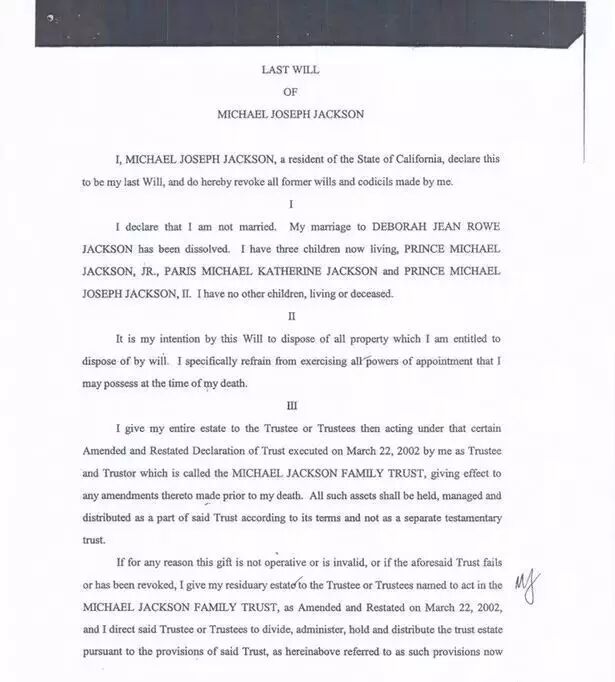 第一,遗嘱声明死后全部财产交付迈克尔杰克逊家庭信托(Michael Jackson Family Trust),其3个子女和母亲作为为信托的受益人;