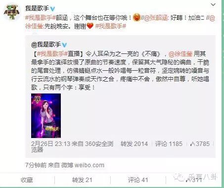 张韶涵也是在微博上祝福徐佳莹,而《我是歌手》节目组却表示在等待张韶涵,是的,我们都在等你。陪伴过我童年的张韶涵,爱你。