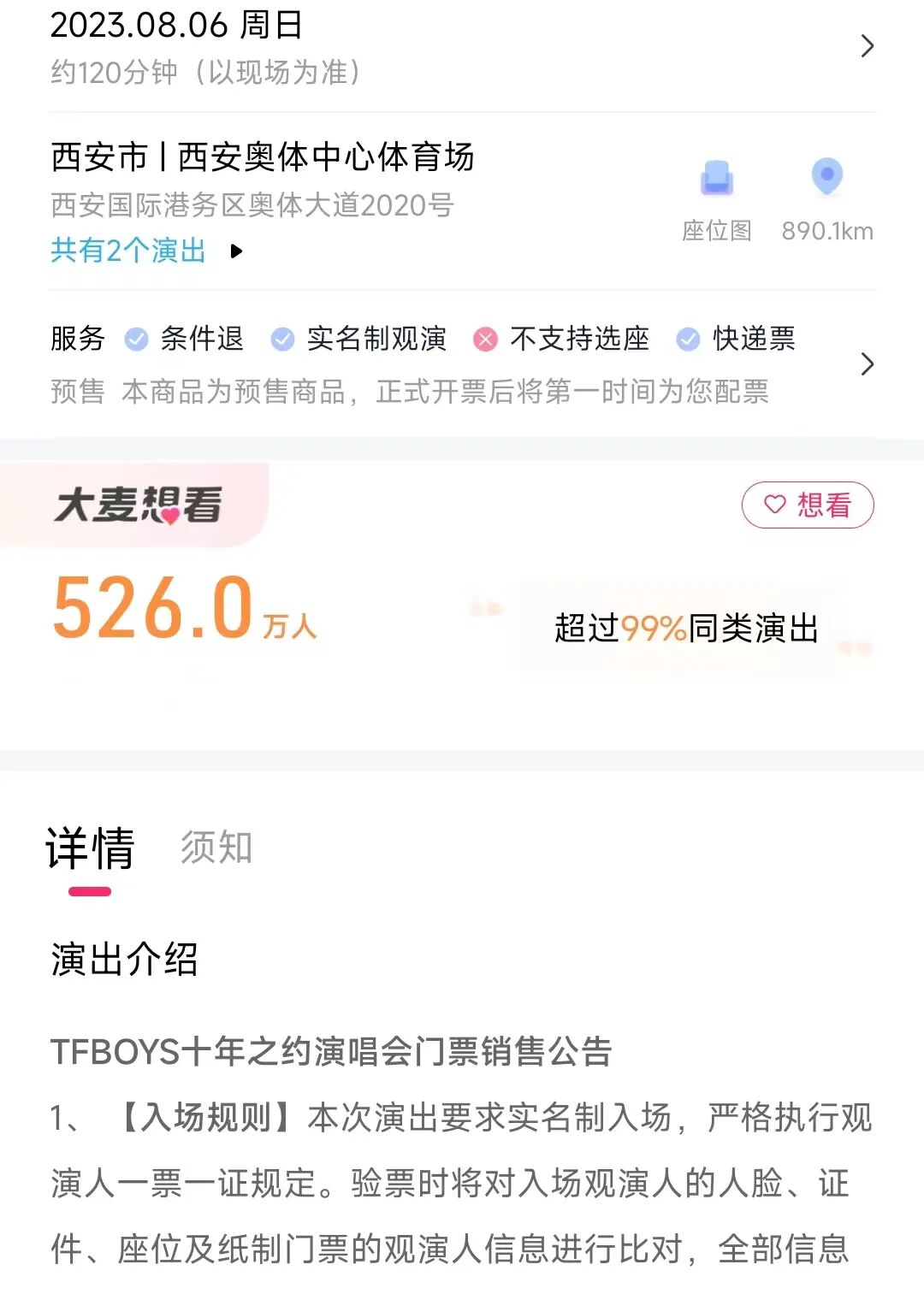 相关信息显示,此次演唱会总共三万多张票,一共进行了三轮售卖。7月24日,“TFBOYS十年之约演唱会”首波门票在大麦网开售即秒空,光标记想看的人数就达到600多万。