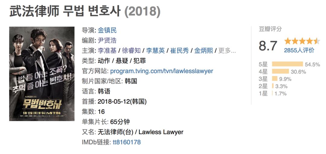 《武法律师》虽然算不上太大胆,内壳还是个老套的复仇剧,但在豆瓣上已经打到8.7分,算是这段时间以来分数最高的韩剧▼▼▼