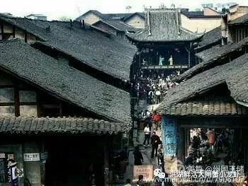 它用粗大的圆木做房屋的框架,用木板建造墙壁和地板,用黑色布瓦盖屋顶的二层结构的楼房,房屋前半截建在陆地临街处,街道用麻石铺就,房屋后半截用木柱架设凌空悬在江上,江水从屋里地板下哗哗流过……
