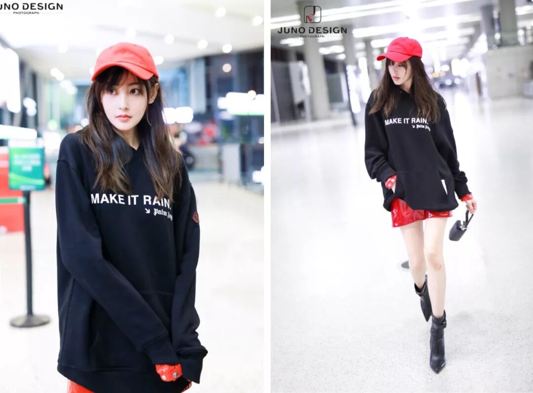 江疏影的白色logo卫衣下衣失踪法,运动鞋加上长筒袜,休闲感更多,减龄效果也赞。