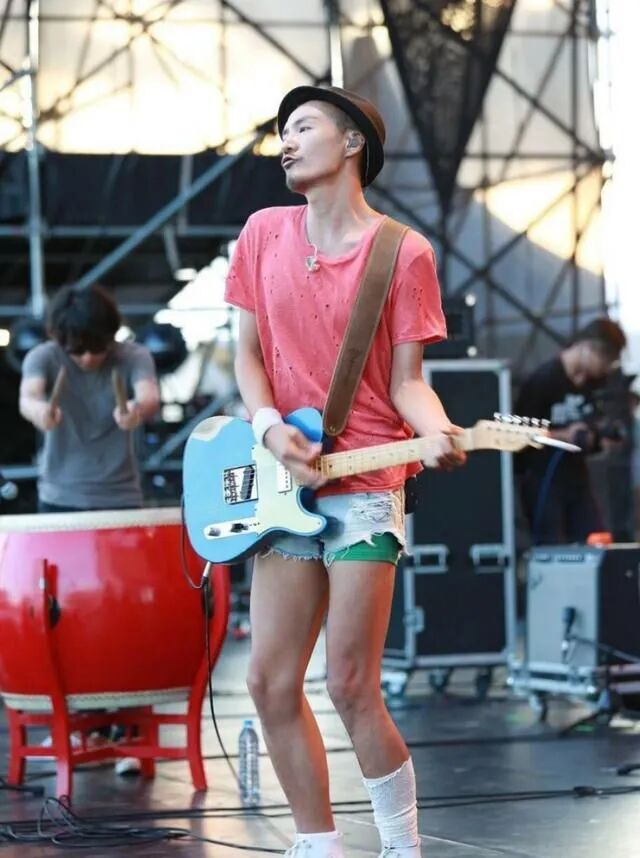 西瓜红短袖上面也布满了破洞的设计,看上去清凉透气很适合夏天穿着。下半身是一条蓝色的牛仔短裤,因为裤子太短里面的绿色底裤不小心露了出来实在骚气。脚上是白色帆布鞋是很日常百搭的时尚单品,也是这套行头里面最中规中矩的一件。从朴树拿着吉他忘我的神态里就能窥见他对音乐的痴迷。
