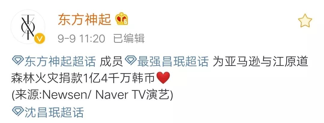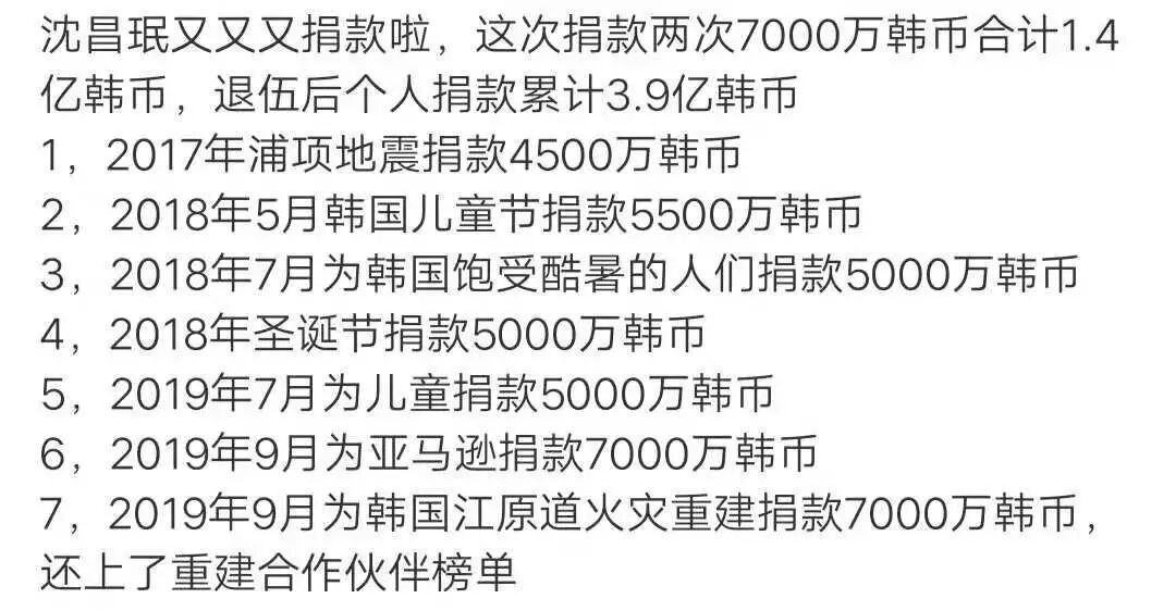 “韩国组合‘东方神起’成员MAX昌珉(沈昌珉)为遭受重大火灾破坏的亚马逊雨林捐赠7千万韩元(约6万美元)。目前,这笔钱正被用于抵抗野火在亚马逊的继续肆虐。同时,沈将另一笔同样金额捐赠给韩国环境慈善团体Tree Plant,用于4月山火过后山坡植树工程。”