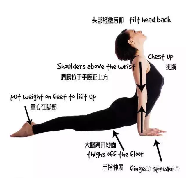 手:手臂直立支撑,手腕、肘、肩在一条线上,肘窝向内,手指向前,肩关节向外向后旋转(感觉耳朵与肩膀的距离扩大),使肩显方形(而不是圆肩)。这时,上身感觉是悬挂在两臂的支撑面上。