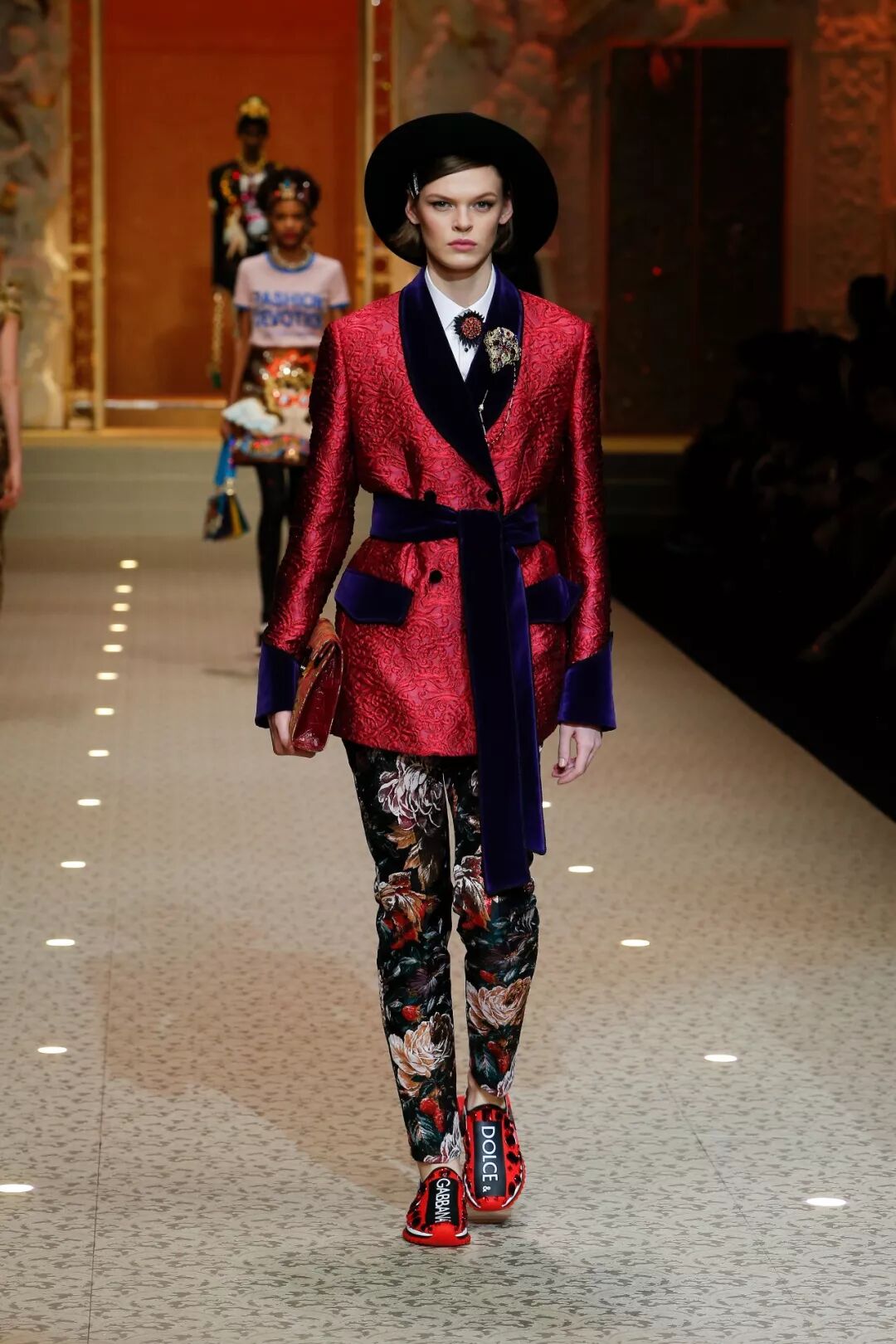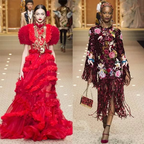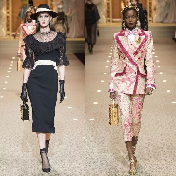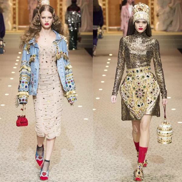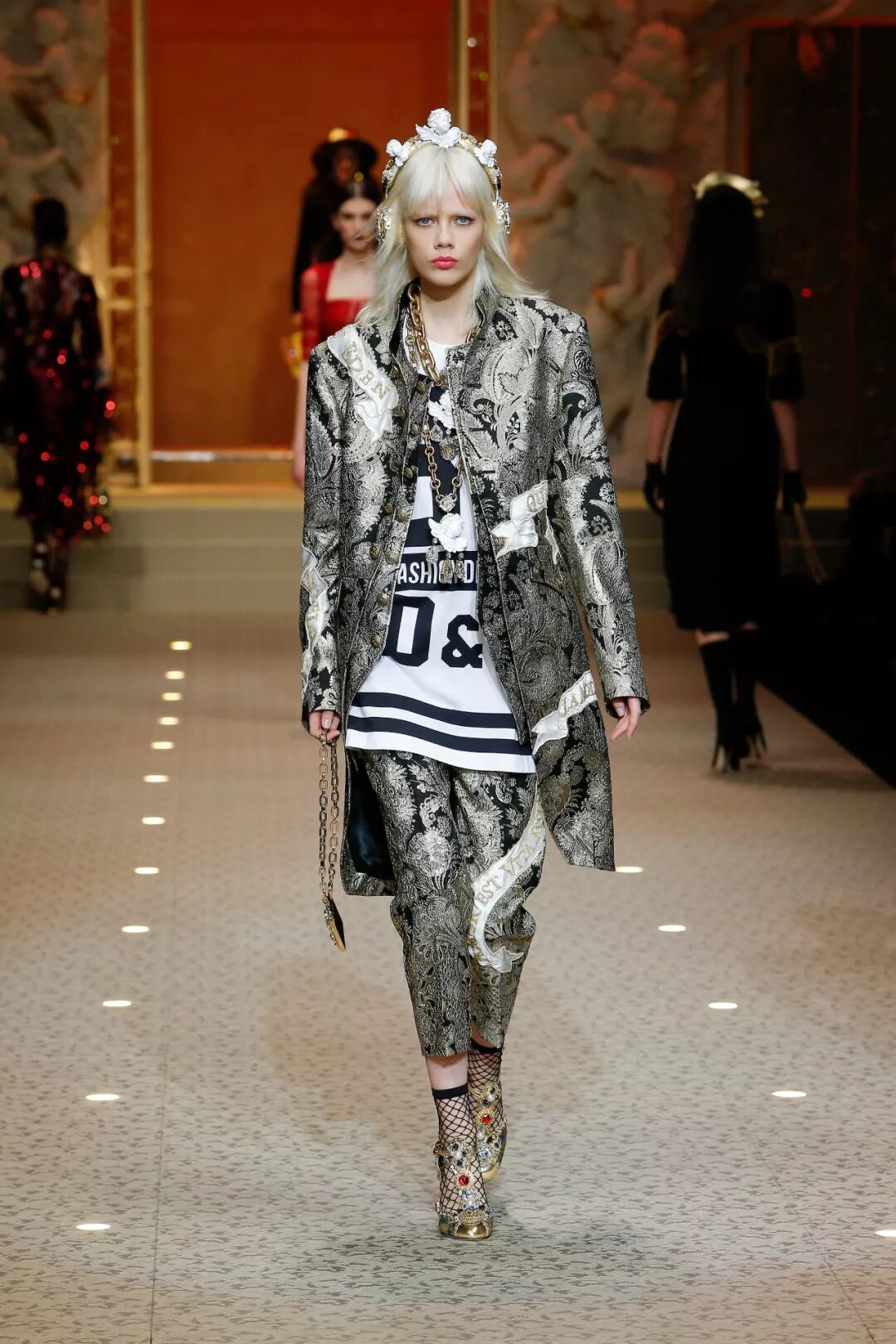 这场秀里巴洛克风情金边刺绣、缜密排列的华丽亮片,有的甚至还镶满闪亮钻石和诱人珠宝……丝丝缕缕的金丝银线交触在一起,闪亮的金丝塑造出Dolce&Gabbana独有的气质。